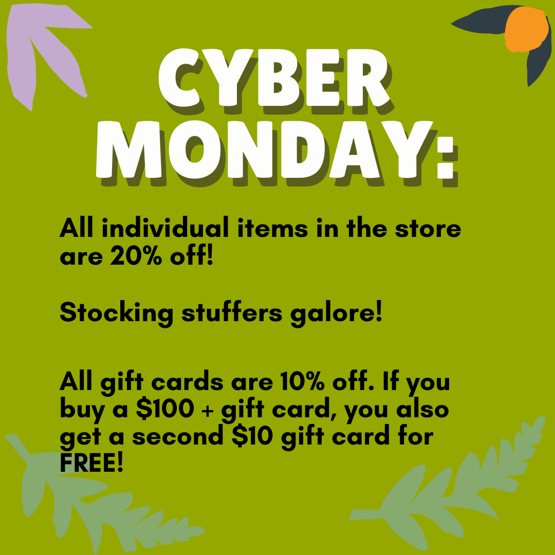 Don't forget gift cards- all 10% off and for every $100 card, you get an additional $10 gift card!