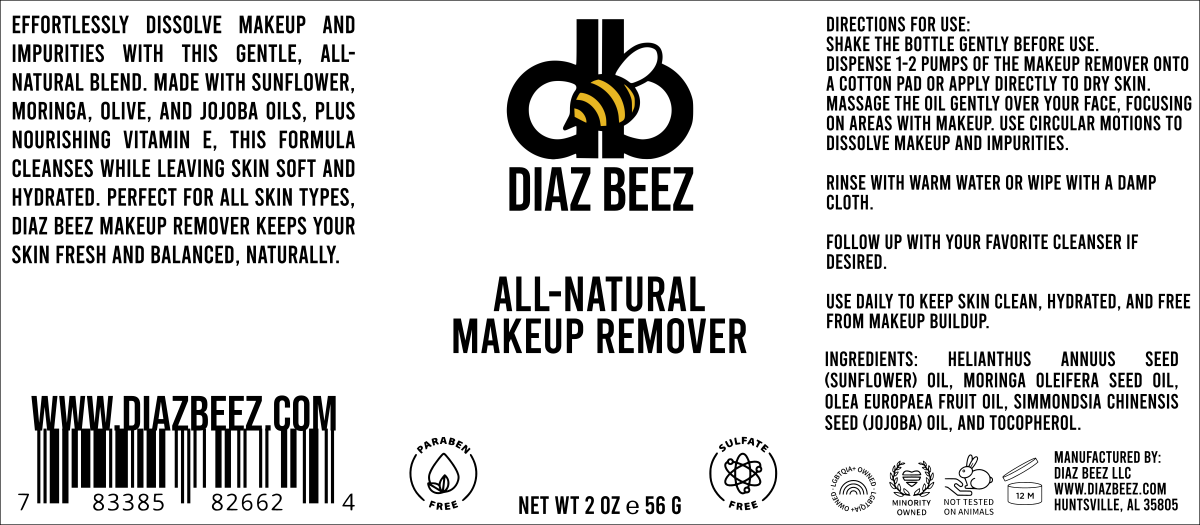 Remove makeup naturally and nourish your skin with Diaz Beez All-Natural Makeup Remover. This gentle formula effectively dissolves makeup, impurities, and even waterproof products, all while soothing and hydrating your skin.