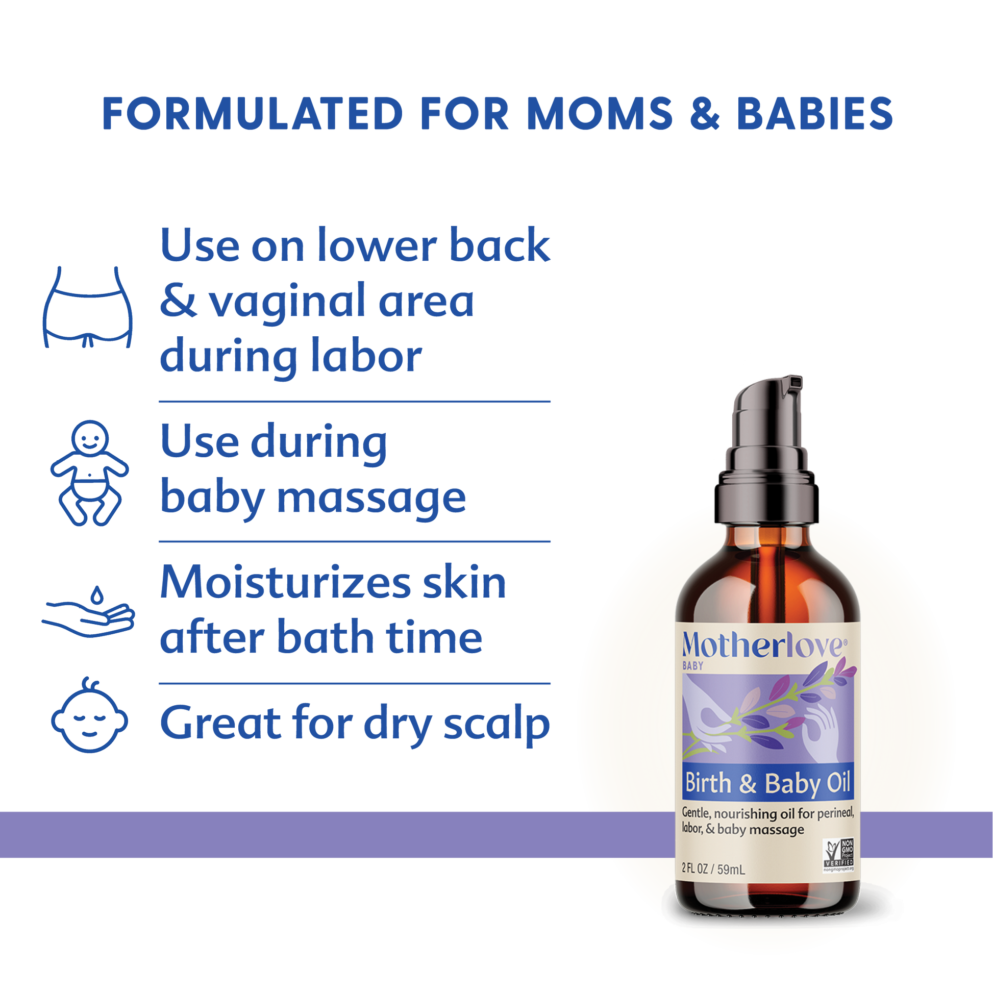 Birth & Baby Oil is a gentle, nourishing oil that is perfect for delicate skin. This vegan oil is infused with organic lavender blossoms and has a relaxing, pleasant scent.
