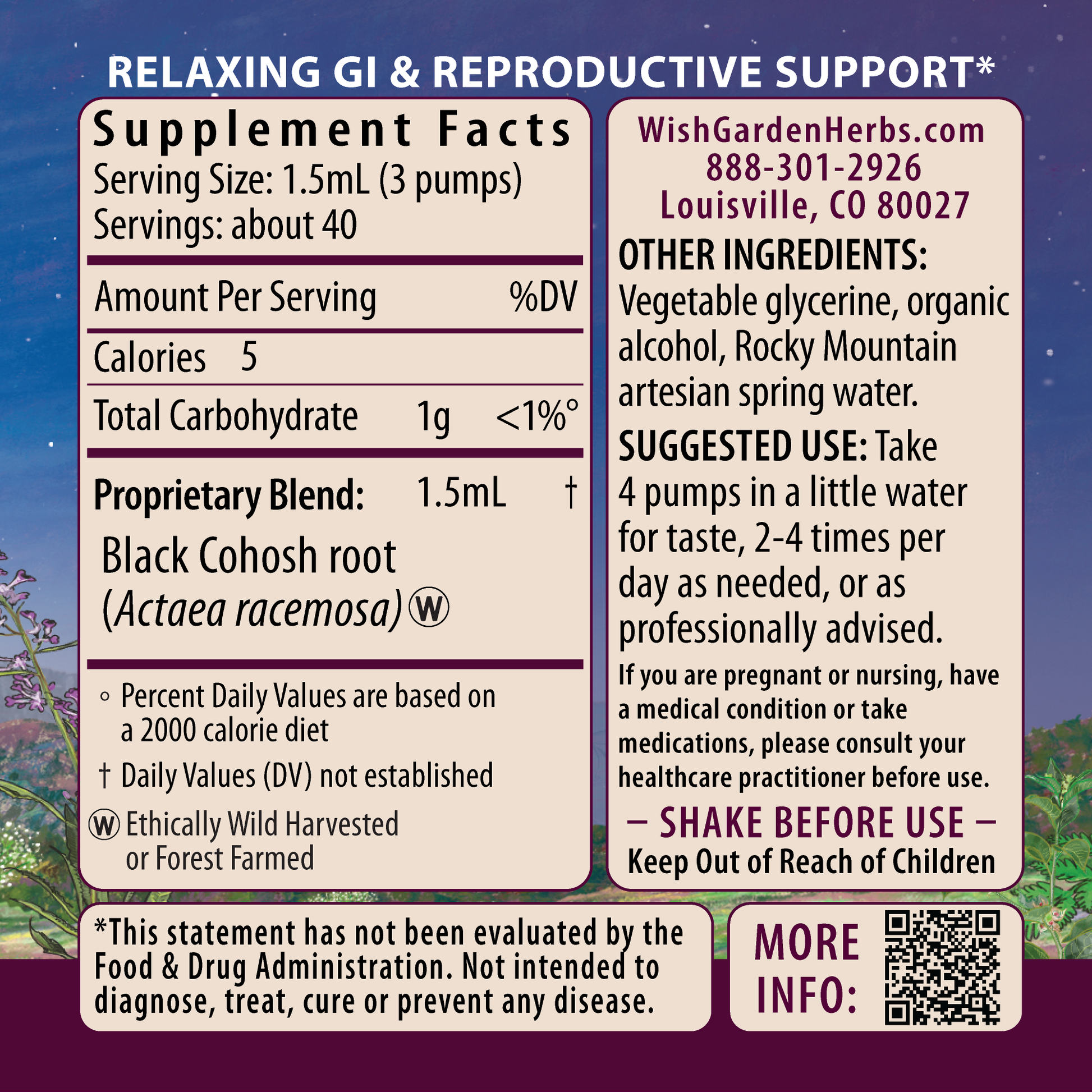 Black Cohosh root (Actaea racemosa (syn. Cimicifuga racemosa)), vegetable glycerine, Rocky Mountain artesian spring water & organic gluten-free alcohol.