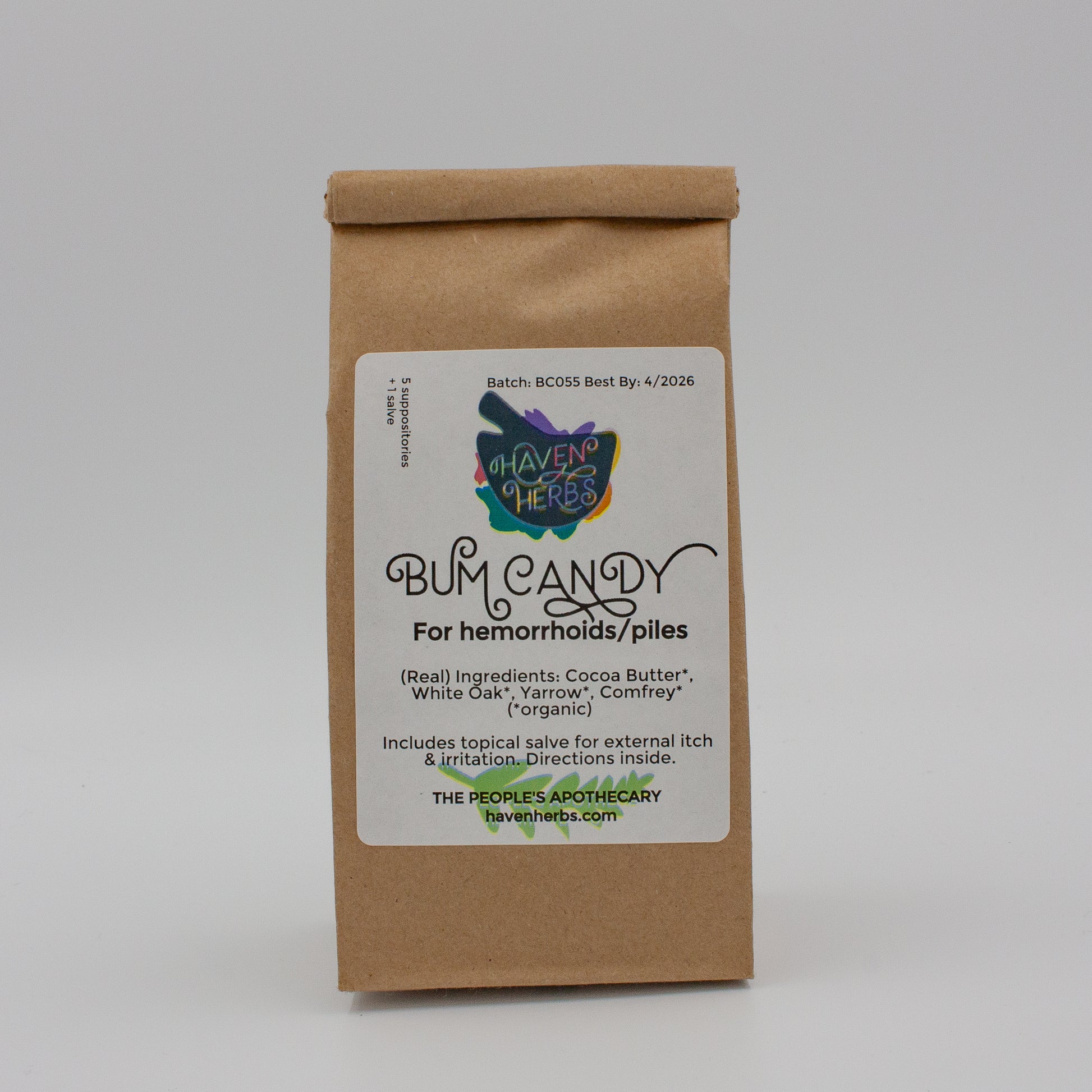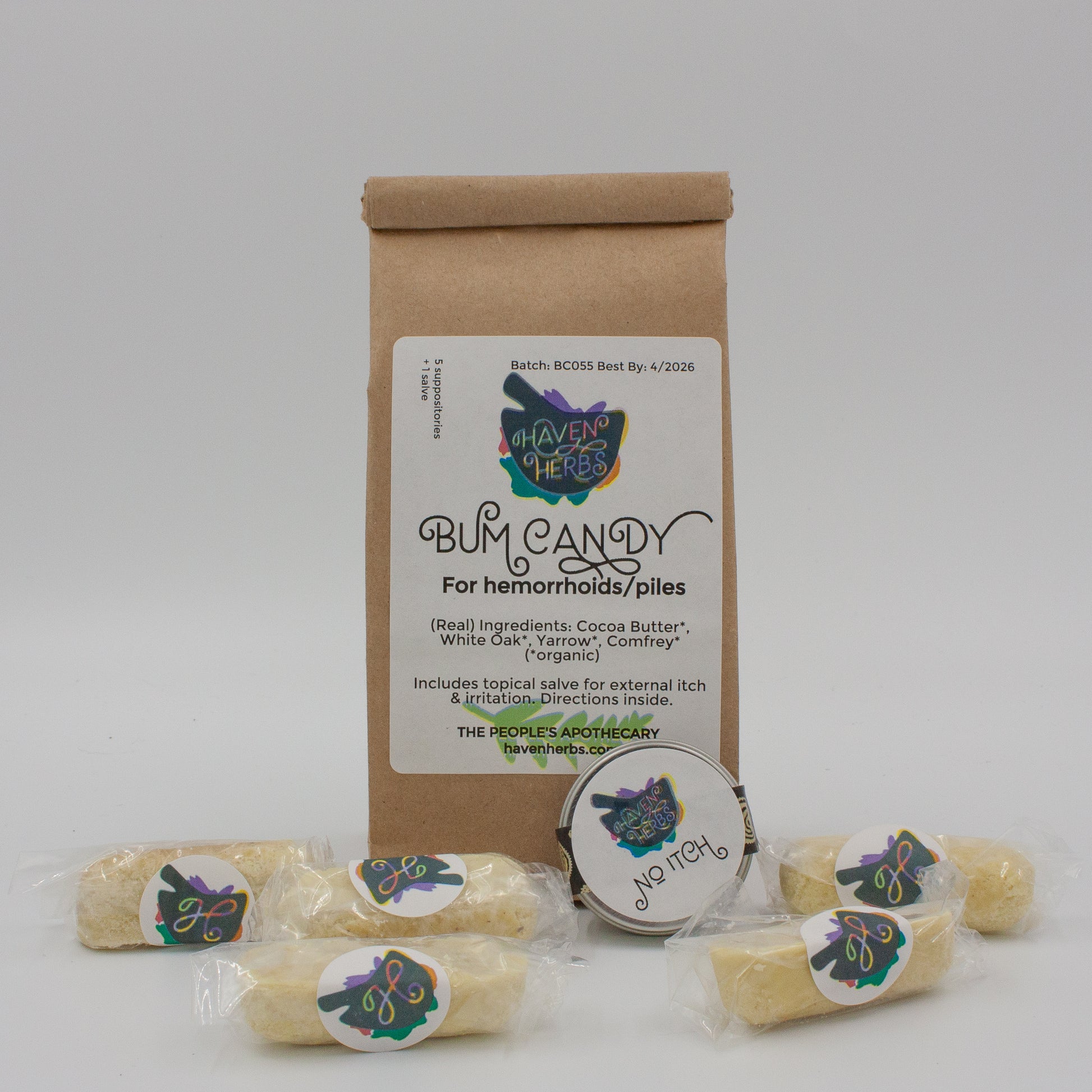 Each bag comes with 5 suppositories, a topical salve, and instructions.