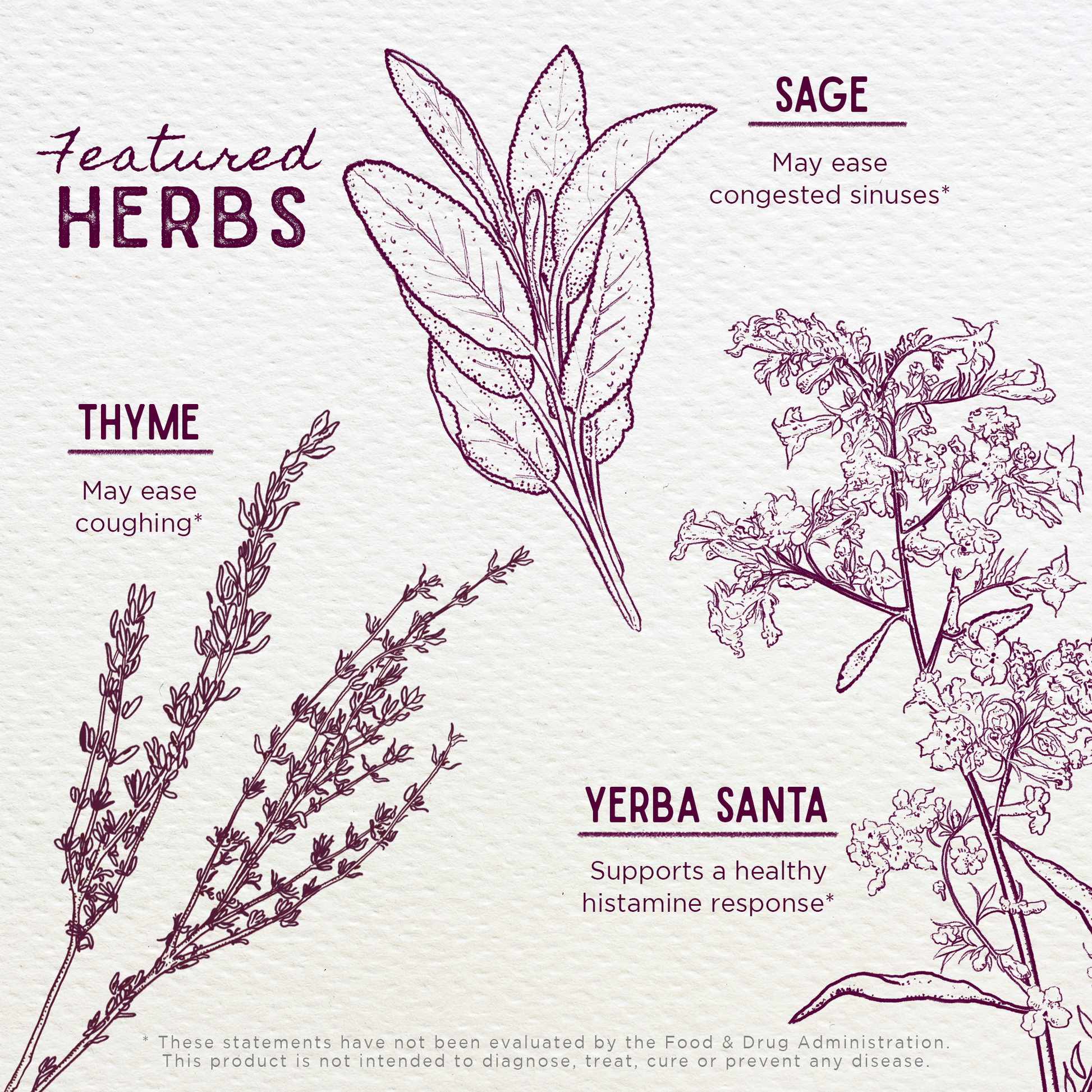 Wild Cherry bark (Prunus serotina), Yerba Santa leaf (Eriodictyon spp. (californicum, angustifolium, crassifolium, trichocalyx)), organic Goldenrod aerials (Solidago spp. (gigantea, virgaurea)), Elderflower (Sambucus nigra), organic Thyme leaf (Thymus vulgaris), organic Sage leaf (Salvia officinalis), organic Peppermint leaf (Mentha piperita), organic Horehound aerials (Marrubium vulgare), vegetable glycerine, Rocky Mountain artesian spring water & organic gluten-free alcohol.