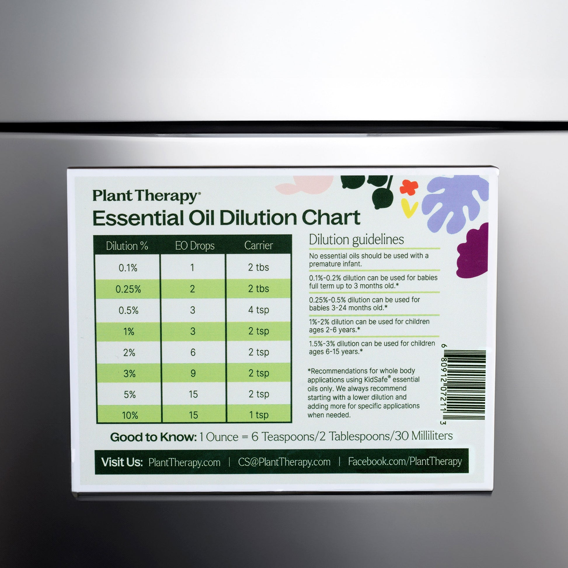 Plant Therapy's Essential Oil Dilution Chart Magnet is the perfect quick-reference guide for safely diluting essential oils. Designed for convenience, this magnet easily sticks to your fridge or any metal surface, ensuring dilution guidelines are always within reach. With a clear, easy-to-read layout, it provides recommended dilution percentages, essential oil drop counts, and carrier oil measurements for safe and effective use. Whether you're blending for children, adults, or specific applications, this chart simplifies the process, helping you confidently customize your essential oil experience. Perfect for beginners and experienced essential oil users alike, this dilution chart magnet is a must-have tool for safe and effective essential oil blending.
