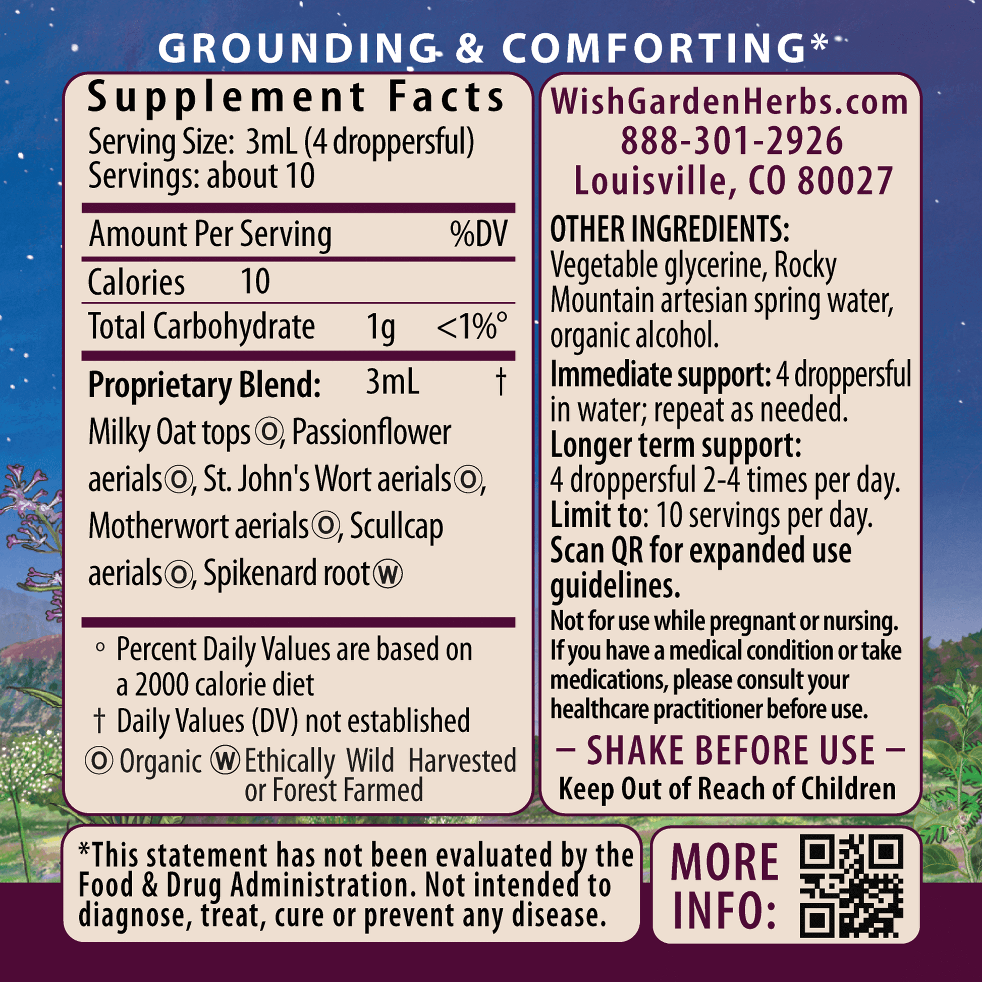 Organic Milky Oat tops (Avena sativa), organic Passionflower aerials (Passiflora incarnata), organic St. John's Wort aerials (Hypericum perforatum), organic Motherwort aerials (Leonurus cardiaca), organic Scullcap aerials (Scutellaria lateriflora), Spikenard root (Aralia racemosa), vegetable glycerine, Rocky Mountain artesian spring water & organic gluten-free alcohol.