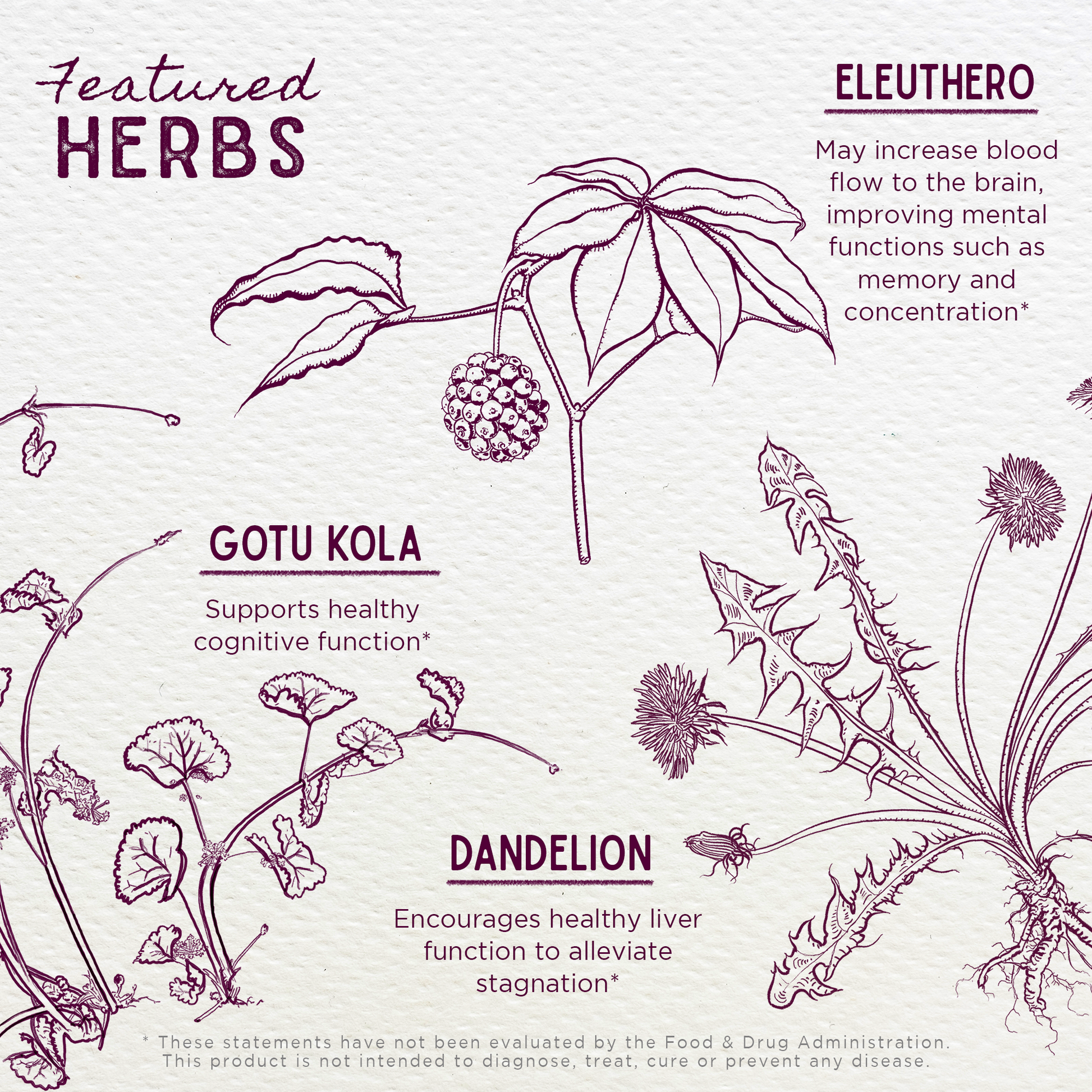 Organic Ginkgo leaf (Ginkgo biloba), Gotu Kola aerials (Centella asiatica), organic Eleuthero root (Eleutherococcus senticosus), organic Dandelion root (Taraxacum officinale), Cinnamon bark (Cinnamomum bumanii, C. cassia), Prickly Ash bark (Zanthoxylum americanum, Z. clava-herculis), Rocky Mountain artesian spring water, organic gluten-free alcohol & vegetable glycerine.