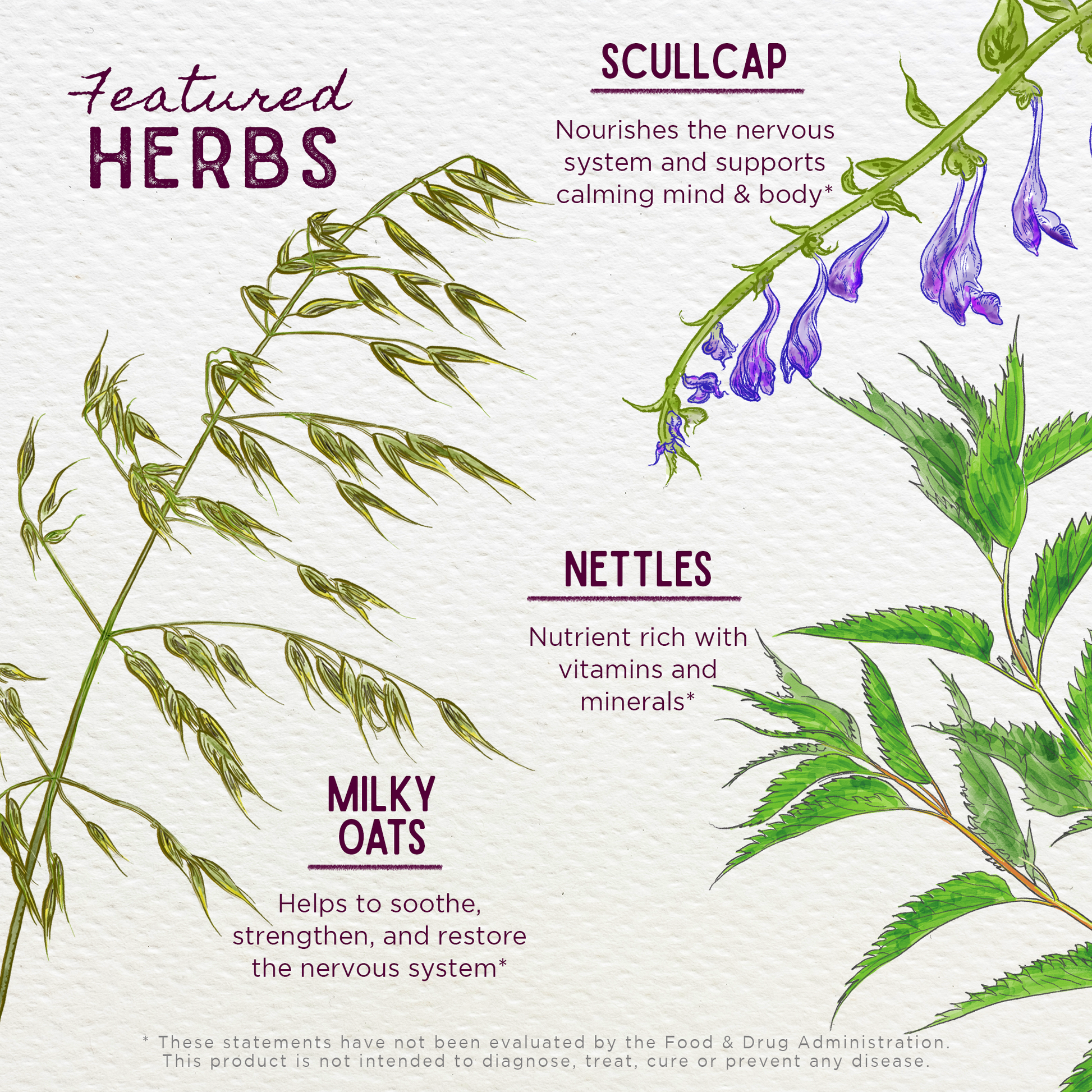 Organic Turmeric root (Curcuma longa), organic White Willow bark (Salix alba), organic Scullcap aerials (Scutellaria lateriflora), organic Chamomile flower (Matricaria recutita, M. chamomilla), organic Milky Oat tops (Avena sativa), organic Nettle leaf (Urtica dioica), vegetable glycerine, Rocky Mountain artesian spring water & organic gluten-free alcohol.