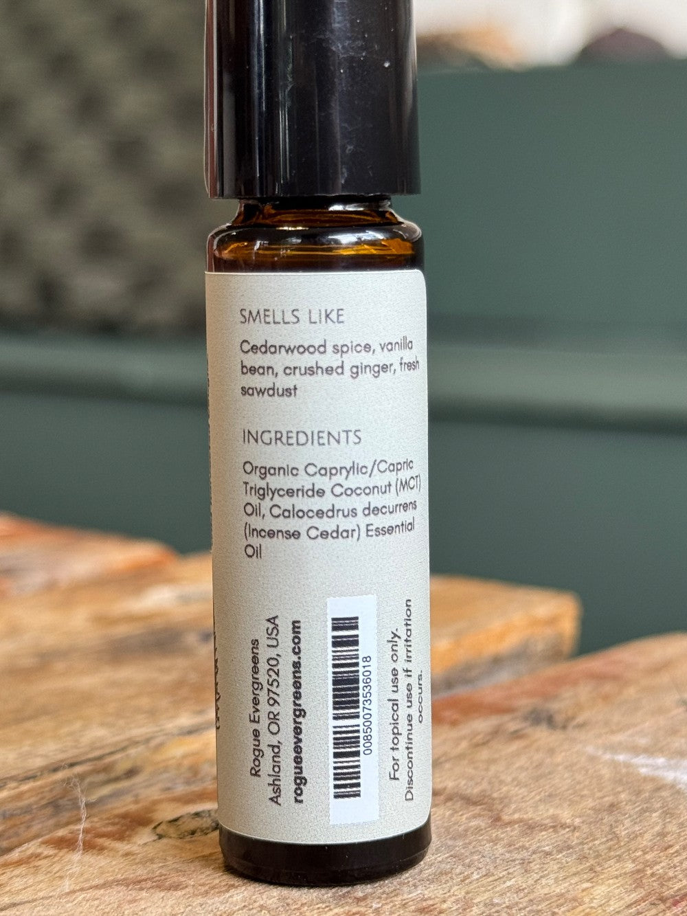 Ready-to-wear Incense Cedar essential oil, pre-diluted in organic fractionated coconut oil (MCT). Deep and mildly spicy with notes of crushed ginger, vanilla bean, and fresh sawdust, finishing warm with a chai-like impression. Perfect as a natural perfume or cologne, conveniently sized for travel and easy to apply at pulse points.