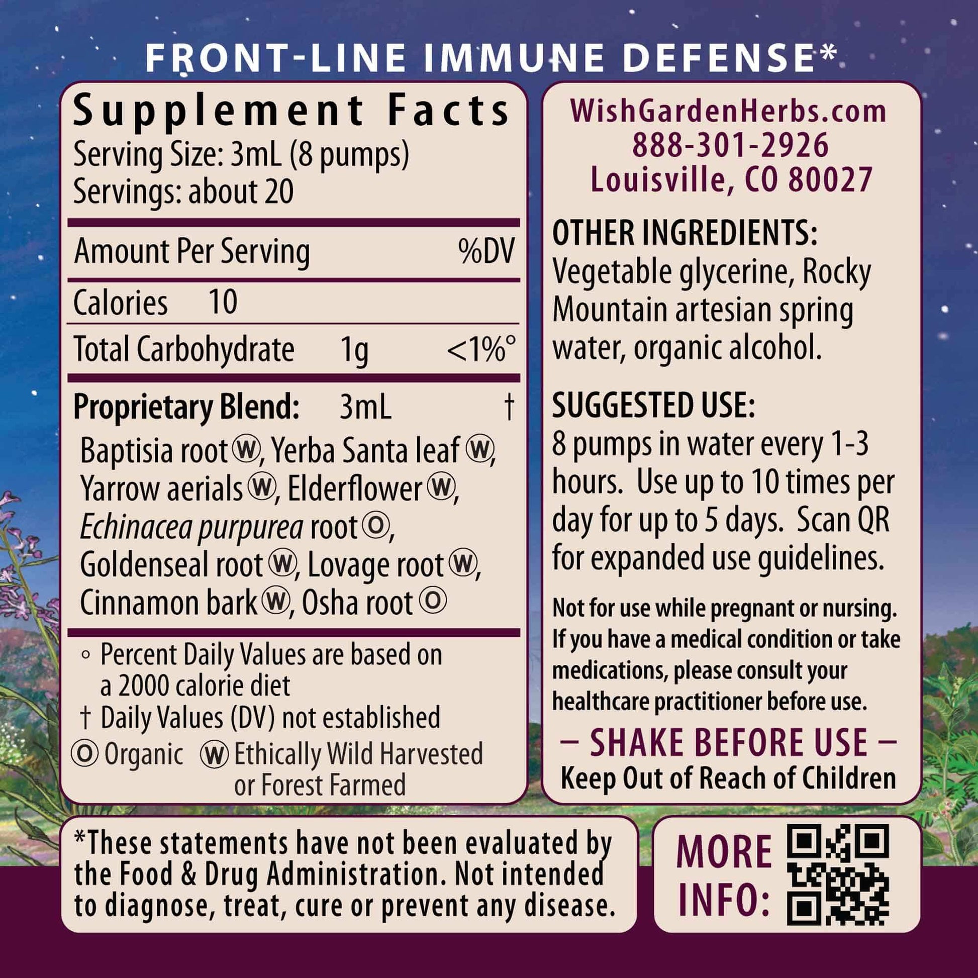 Baptisia root (Baptisia tinctoria), Yerba Santa leaf (Eriodictyon spp. (californicum, angustifolium, crassifolium, trichocalyx)), Yarrow aerials (Achillea millefolium), Elderflower (Sambucus nigra), organic Echinacea purpurea root (Echinacea purpurea), Goldenseal root (Hydrastis canadensis), Lovage root (Levisticum officinale), Cinnamon bark (Cinnamomum bumanii, C. cassia), organic Osha root (Ligisticum Porteri), vegetable glycerine, Rocky Mountain artesian spring water & organic gluten-free alcohol.