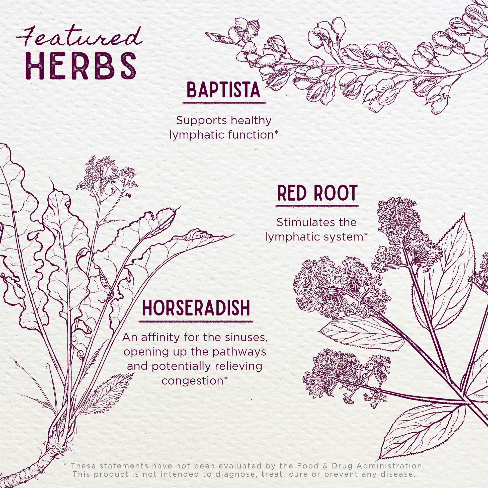 Yerba Santa leaf (Eriodictyon spp. (californicum, angustifolium, crassifolium, trichocalyx)), Elderflower (Sambucus nigra), organic Sage leaf (Salvia officinalis), fresh organic Horseradish root (Armoracia rusticana), Baptisia root (Baptisia tinctoria), organic Goldenrod aerials (Solidago spp. (gigantea, virgaurea)), organic Garlic bulb (Allium sativum), Goldenseal root (Hydrastis canadensis), Red Root (Ceanothus americanus), vegetable glycerine, Rocky Mountain artesian spring water & organic gluten-free alcohol.