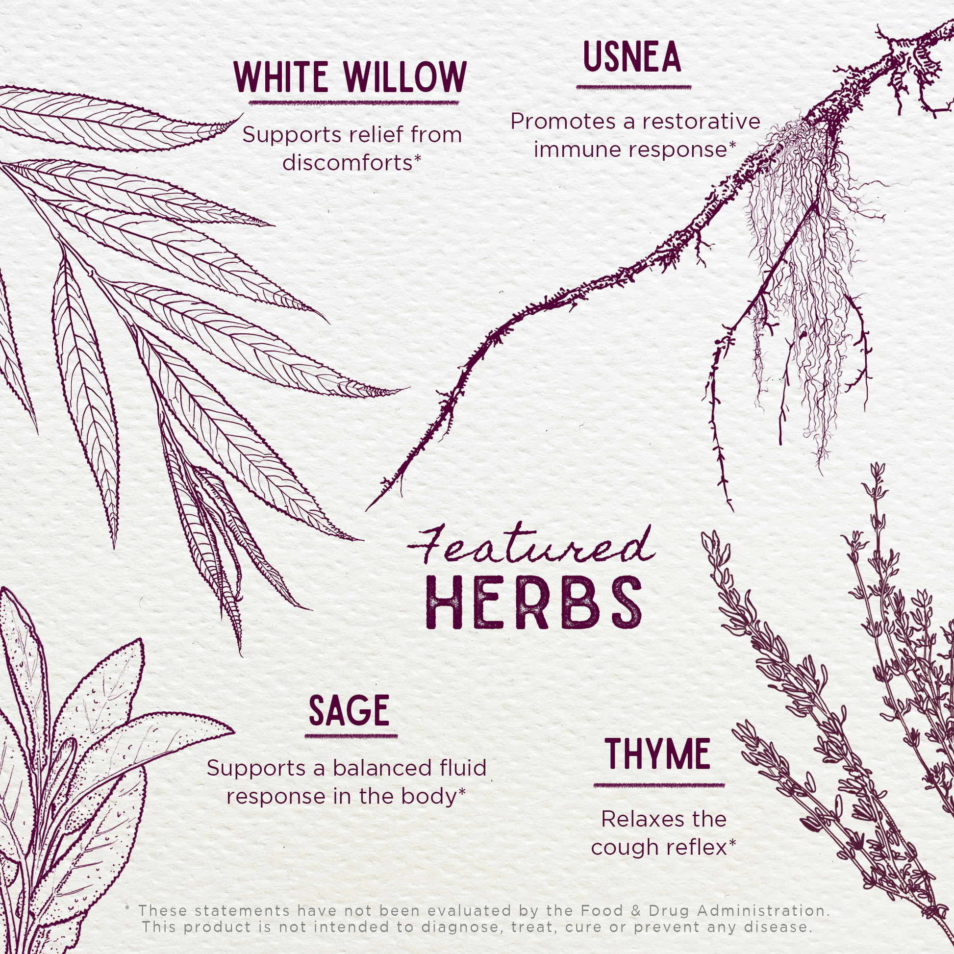 - Thyme leaf: Thymus vulgaris may help soothe occasional cough, supports immune system function, and provides free radical scavenger activity.