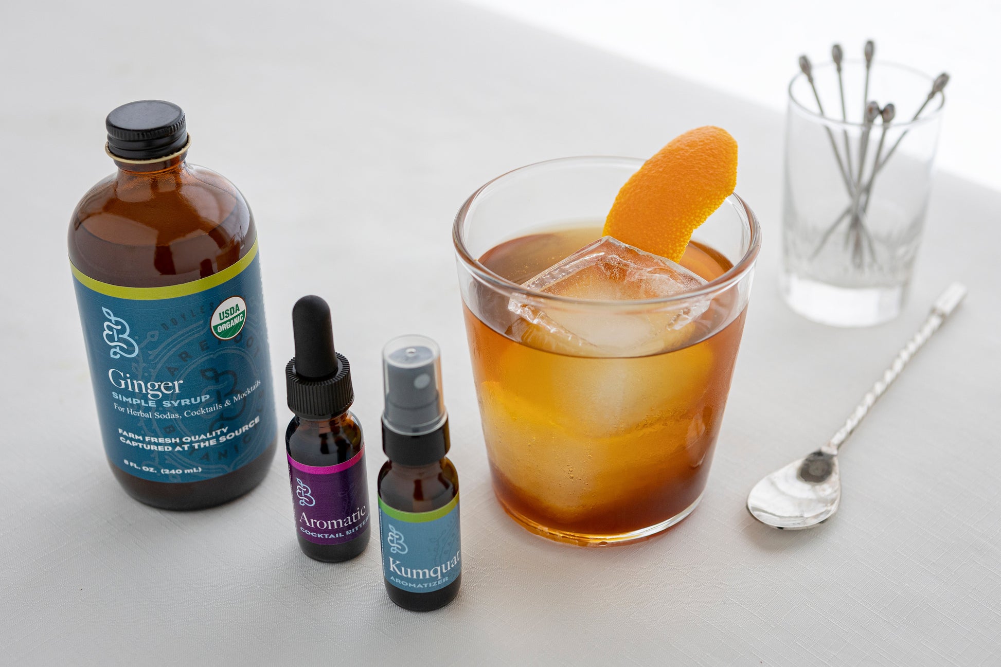 This kit combines the lively heat of ginger, the bright citrus of kumquat, and the layered aromatics of handcrafted bitters. Together, they transform the traditional Old Fashioned into something distinctly botanical, reflective of the land it came from and the hands that crafted it.