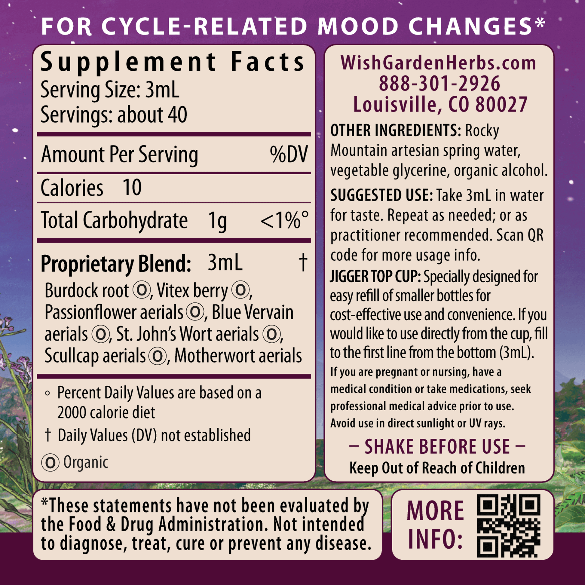 Organic Burdock root (Arctium lappa), organic Vitex berry (Vitex agnus-castus), organic Passionflower aerials (Passiflora incarnata), organic Blue Vervain aerials (Verbena hastata), organic St. John's Wort aerials (Hypericum perforatum), organic Scullcap aerials (Scutellaria lateriflora), organic Motherwort aerials (Leonurus cardiaca), Rocky Mountain artesian spring water, vegetable glycerine & organic gluten-free alcohol.