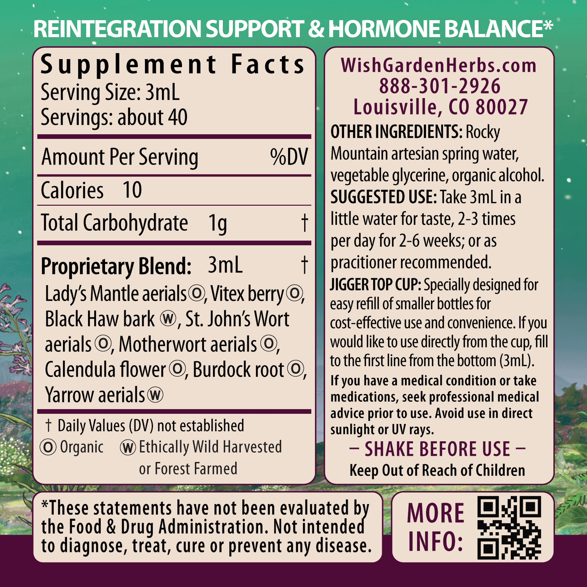 Organic Lady's Mantle aerials (Alchemilla vulgaris, A. xanthochlora), organic Vitex berry (Vitex agnus-castus), Black Haw bark (Viburnum prunifolium), organic St. John's Wort aerials (Hypericum perforatum), Motherwort aerials (Leonurus cardiaca), organic Calendula flower (Calendula officinalis), organic Burdock root (Arctium lappa), Yarrow aerials (Achillea millefolium), Rocky Mountain artesian spring water, vegetable glycerine & organic gluten-free alcohol.