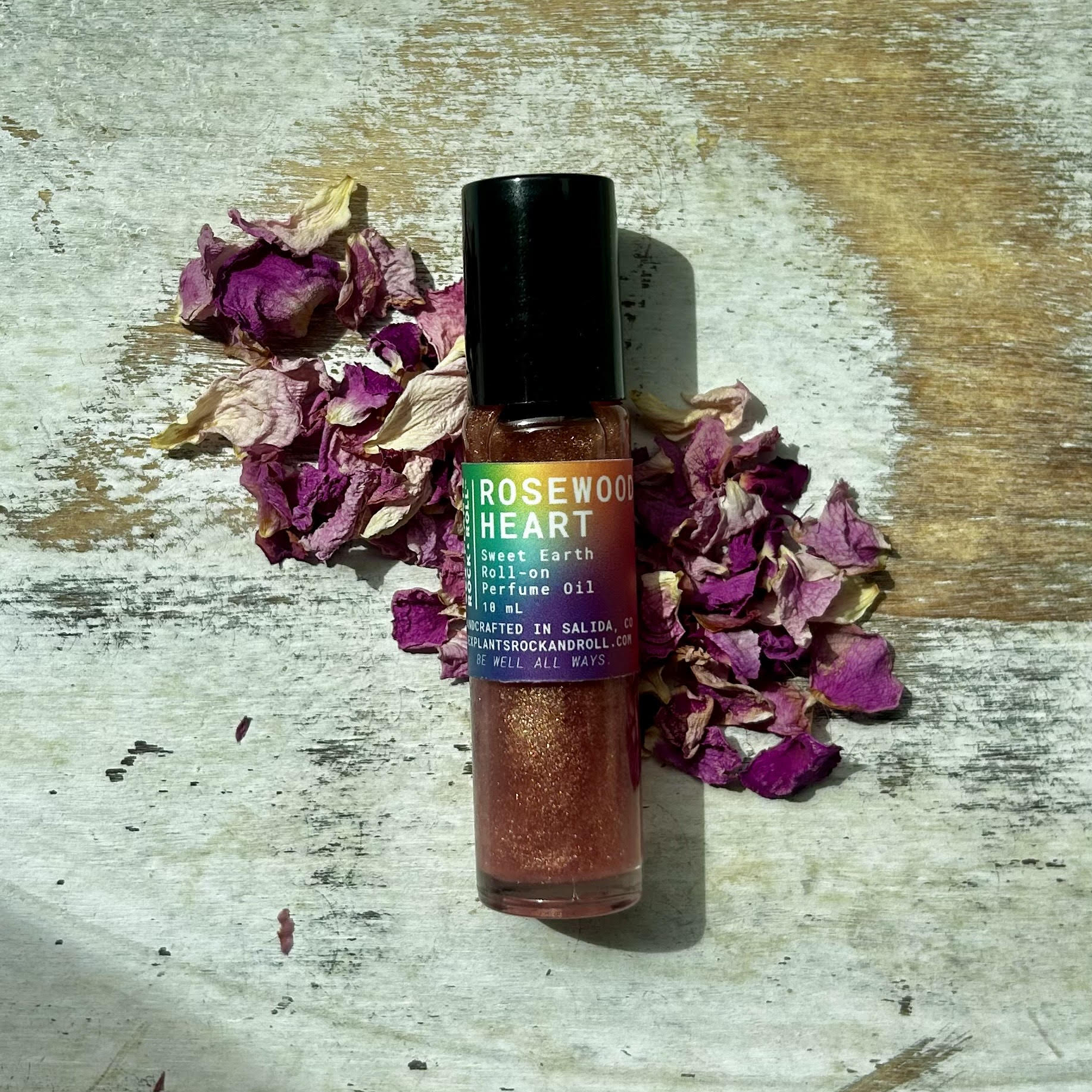 Rosewood Heart is a sweet and earthy natural blend of sandalwood and rose oils. It comes in a glass roll-on bottle and has an aesthetic enhancement of added mineral based tint and shimmer.