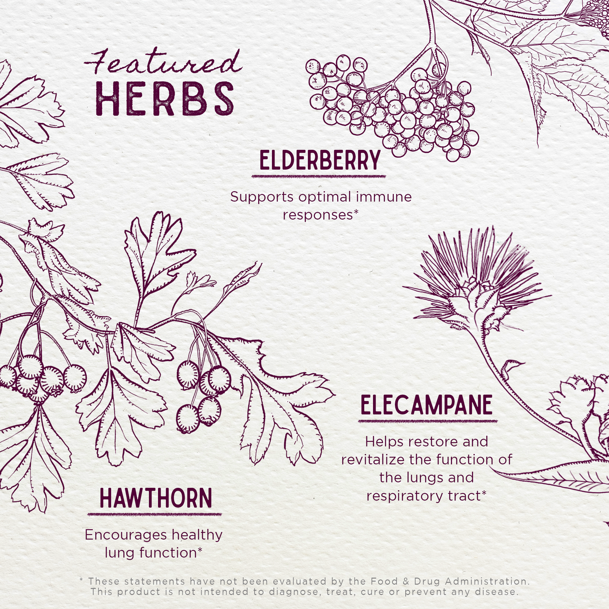 Wild Cherry bark (Prunus serotina), organic Elecampane root (Inula helenium), organic Linden leaf and flower (Tilia europea, T. cordata, T. spp.), Hawthorn berry (Crataegus spp.), organic Marshmallow root (Althaea officinalis), organic Elderberry fruit (Sambucus nigra), Vegetable glycerine, Rocky Mountain artesian spring water, locally sourced honey & organic gluten-free alcohol.